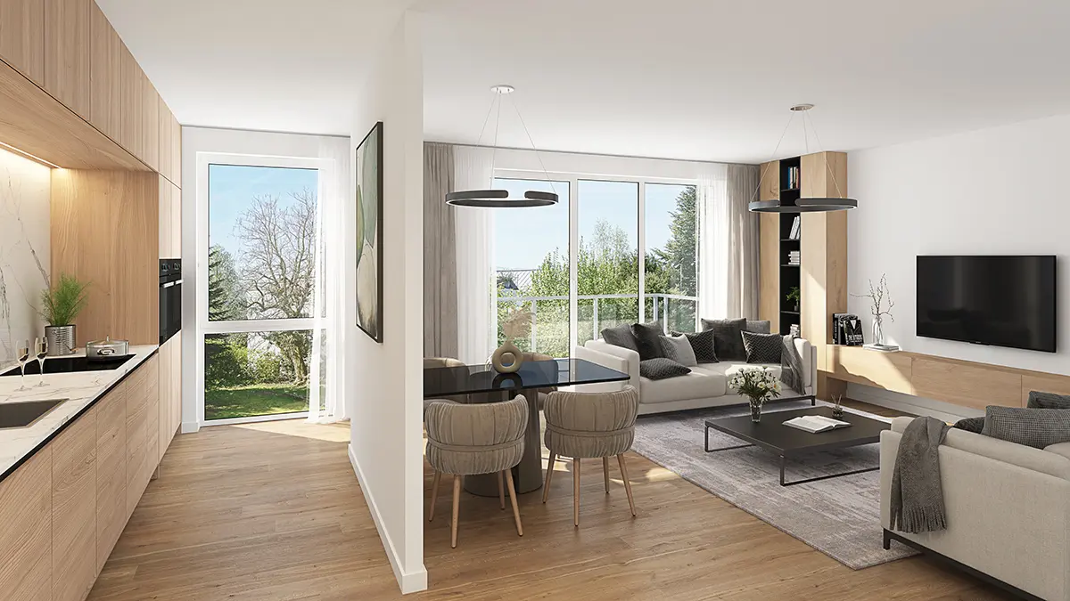 Die Wohnungen sind nach Süden ausgerichtet, die Wohn-Essräume mit angrenzenden Terrassen, Balkonen oder Dachterrassen sind zur sonnigen Gartenseite angeordnet.